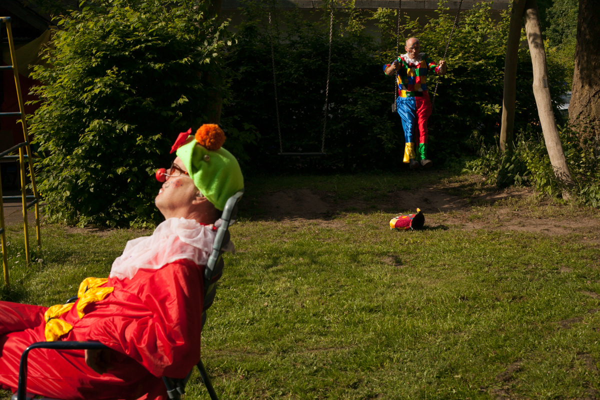 Zum ersten Mal begegnete ich dieser bunten Familie während der Abschlussvorstellung einer Clown-Ausbildung in Hannover. Uli (ebenfalls auf den Fotos zu sehen) kam auf die Bühne, um ihr Diplom entgegenzunehmen, als die Familie Bombastico die Bühne eroberte und sie mit Konfetti zum Clown taufte. Ich war fasziniert und beschloss bald, ihnen während dieser Projektwoche mit der Kamera zu folgen.